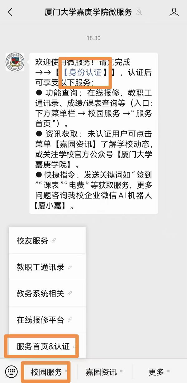 3. 关注公众后,进入公众号页面,点击图片中的“身份认证”;(如果没有如下方图片中的“身份认证”,可点击下方的菜单栏“校园服务”—》“服务首页&认证”)
