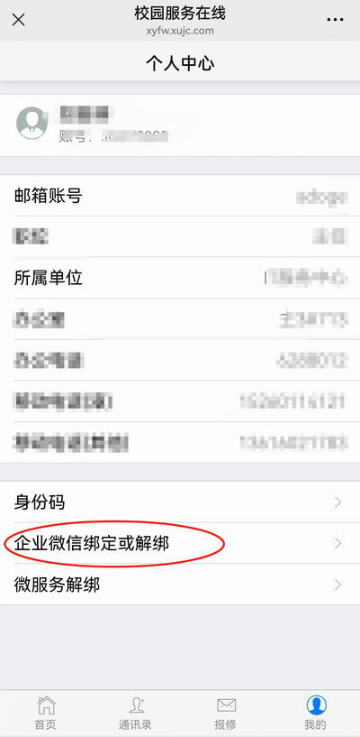 然后,进入“我的”页面-》点击“企业微信绑定或解绑”如下图,详细流程请点击查看【厦门大学嘉庚学院企业微信认证指南】