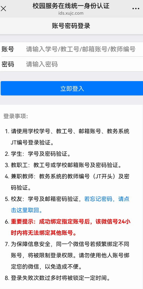 4. 进入认证页面(如下图),进行身份认证(注:教师和行政人员认证账号密码为邮箱账号密码。兼职教师的账户为教务系统对应的教师代码(如:JT0000),密码:初始密码(默认为身份证后8位))。